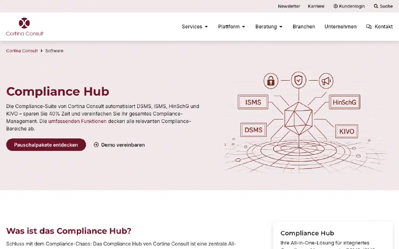 Modular German compliance platform from Cortina Consult. Whistleblowing (HinSchG) is one of three core modules; from €45/month.